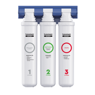 БАРЬЕР ЭКСПЕРТ Механика - предварительная очистка воды. Фильтроэлемент из напыленного полипропилена стойкостью фильтрации 5 мкм очищает воду от нерастворимых механических примесей (ржавчины, окалины, ила, песка и т.п.). БАРЬЕР ЭКСПЕРТ Смягчение - предотвращает образование накипи. Эффективно снижает карбонатную жесткость, из-за которой образуется осадок в чайнике. Средний ресурс ступени по жесткости до 6 месяцев. БАРЬЕР ЭКСПЕРТ Ультра - финишная очистка и ультрафильтрация. Сохраняя полезный минеральный состав воды, ультрафильтрация обеспечивает абсолютную эффективность очистки воды от бактерий. В основе технологии ультрафильтрации лежит принцип мембранной очистки воды с размером пор не более 0,1 мкм. |