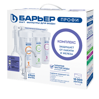 Трехступенчатый фильтр Барьер ПРОФИ Комплекс качественно очистит воду при высоких содержаниях железа и солей жесткости.